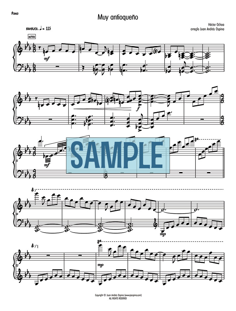 An original, unpublished arrangement for solo piano of Héctor Ochoa’s well-known bambuco “Muy antioqueño”.